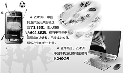 事实上,近年来我国的游戏业开始进入快速发展时期。2012年,中国网游产业用户规模达到了3.36亿、收入规模为602.8亿元,相当于当年电影票房的3倍多,已经成为文化娱乐产业的新生力量。网游产业其中又以页面游戏和手机游戏增长较快,2012年实际销售收入分别增长了46%和91%。业内预计,2015年中国手机游戏市场规模将达240亿元。