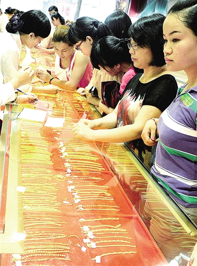 7月7日,市民在江苏省苏州市一家金店内挑选黄金饰品。近日,受纽约期货金价大跌影响,江苏苏州各大金店黄金饰品价格从6月下旬的348元/克下调至328元/克,吸引不少市民前来选购。