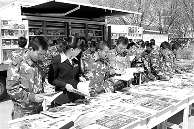 为营造“多读书、读好书”的良好学习氛围,武警新疆生产建设兵团指挥部五支队与驻地新华书店协商,专门成立了一座“警营流动图书馆”,定期开展送书进警营活动。图为支队官兵们正在“警营流动图书馆”前认真挑选书籍。 徐葛林摄