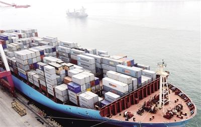 7月8日,一艘货轮在山东青岛港装卸集装箱。