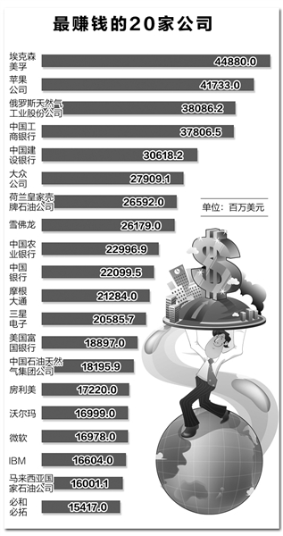 本报纽约电 记者张伟报道:《财富》杂志公布的世界500强榜单数据显示,2013年世界500强入围门槛增至232亿美元,总收入比上一年增至30.3万亿美元,增幅2.77%。但是总利润跌至1.5万亿美元,跌幅为5.5%。市场分析人士指出,出现这一现象的主要原因,一是壳牌、雪佛龙等石油公司的纯利润下降了,二是说明世界经济总体形势不乐观。