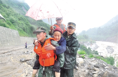 上图 武警四川总队德阳支队官兵正在转移受灾群众。姜永安摄