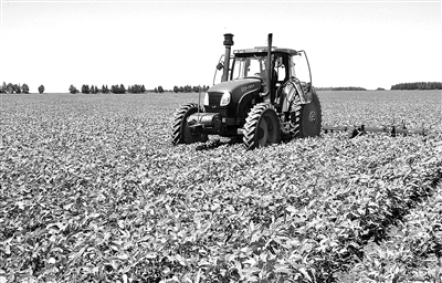7月10日,黑龙江垦区五大连池农场第十管理区工人驾驶农机对大垄密植大豆进行中耕作业。黑龙江垦区近期大规模开展大豆机械中耕深松土壤及喷施叶面肥作业,改善土壤物理性质,促进大豆营养物质的吸收,为大豆丰产增收打好基础。 陆文祥摄(新华社发)