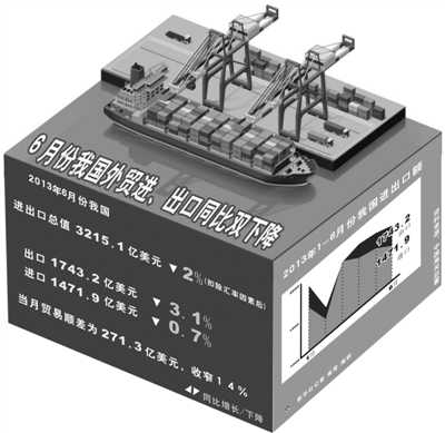 6月当月,我国进出口总值为3215.1亿美元,下降2%。据悉,上一次外贸进、出口出现“双降”还是在2012年1月份,且主要受季节性因素影响。时隔17个月后,进、出口数据“双降”重现,一定程度上反映了当前我国外贸基本面上的压力和困境。