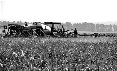 在黑龙江北安市建设农场第三管理区,玉米种植户使用喷药机为玉米喷施矮化专用药剂。玉米矮化处理可减少营养损耗和水分散失,提高作物的抗病性,从而有助于玉米增产。 周良君摄 (新华社发)