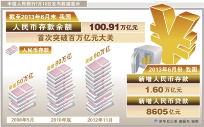 本报北京7月12日讯 记者王信川报道:中国人民银行今天发布的数据显示,截至6月末我国人民币存款余额达100.91万亿元,首次突破百万亿元大关。