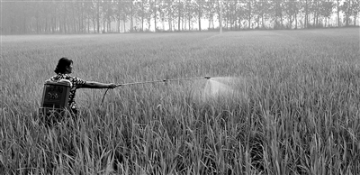 下图 7月13日清晨,江苏省徐州市睢宁县常青村农民在水稻田里喷药防治病虫。 洪 星摄 (新华社发)