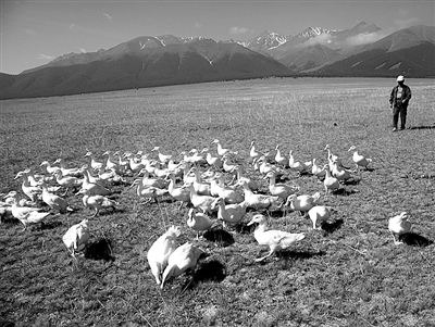这是7月3日在新疆巴里坤草原拍摄的治蝗鸭群。 张建刚摄 (新华社发)