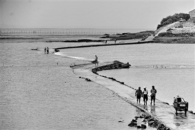 位于福建省莆田市北高镇汀江村的草屿岛,四周环绕近6000亩养殖涂滩。今年2月,村民郭金通等筹资近200万元,自发填海修路。这条600多米长的路为村民到滩涂劳作提供了便利。图为6月底村民们走在“跨海路”上。