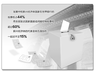 世界银行的报告预测,在2012年到2025年期间,新兴经济体的平均增长率将为发达国家的两倍以上,其中,金砖国家将引领新兴国家,在所有全球增长中占据一半以上的份额。但是,发展中和新兴经济体国家在世界银行的投票权仅占44%,其中中国仅占2.77%,新兴经济体的代表金砖五国加在一起还不足15%,而全部发达国家直接或间接控制投票权则超过60%。新兴国家迫切需要一个崭新的、平等的、与其日益重要经济地位相称的全球经济治理机制,表达其在新的世界经济格局中的经济主张。