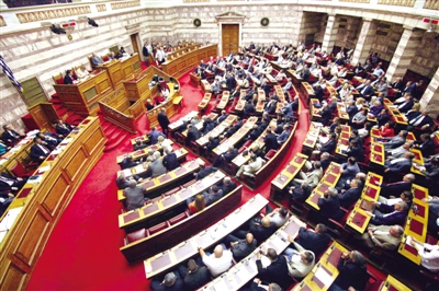 7月18日,议员们在希腊首都雅典参加议会投票。希腊议会18日凌晨通过包括大规模裁员等内容的一揽子紧缩法案,为希腊近期获得数十亿欧元的救助贷款铺平了道路。 (新华社发)