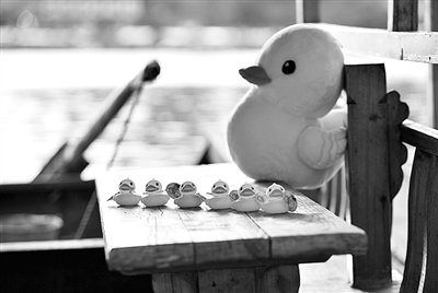 近日,风靡全球的“大黄鸭”将于9月来京的消息引起了人们的关注。虽然它的落脚地尚未确定,但呼声较高的什刹海景区却率先举办“大黄鸭北京欢迎你”活动。绒毛版和橡胶Q版的“小黄鸭”摆上什刹海景区的摇橹船,陪伴游人一起游览。 新华社记者 李 鑫摄