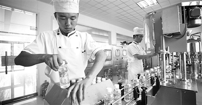 武警8670部队驻晋某部地处中条山腹地,干旱缺水、地下氟化物含量严重超标。该部积极改善基层官兵生活条件,筹措资金购买自动化净水生产线,还为单独执勤的驻点购置饮水机,彻底解决了官兵的饮水安全问题。图为官兵们正在纯净水生产车间工作。 梁兼铭 宋 海摄