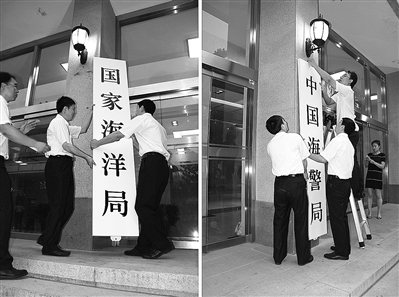 左图 7月22日清晨,工作人员在悬挂国家海洋局的门牌(左)。7月22日清晨,工作人员在悬挂中国海警局的门牌(右)。 新华社记者 罗 沙摄