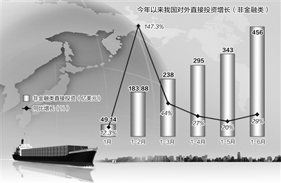 上半年我国境内投资者共对全球144个国家和地区的2912家境外企业进行直接投资,累计实现非金融类直接投资456亿美元,同比增长29%