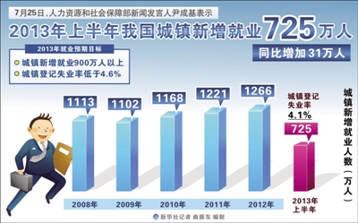 人力资源和社会保障部新闻发言人尹成基在25日召开的新闻发布会上说,通过实施就业优先战略和更加积极的就业政策,今年上半年,城镇新增就业持续增长,就业形势总体稳定。今年上半年,城镇新增就业达725万人,比去年同期增加31万人,二季度末城镇登记失业率保持在4.1%,与一季度和去年同期持平。