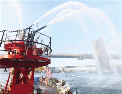 7月24日,约翰·哈维号消防船在美国纽约哈德逊河上进行喷水展示。建于1931年的约翰·哈维号消防船是纽约最早的现代消防船只之一,它长130英尺,重260吨,每分钟能喷射18000加仑灭火用水。 (新华社发)