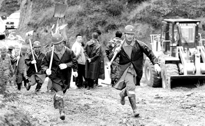 一处塌方堵在眼前,滑落的土石将大路切断,形成小“堰塞湖”,“湖水”快速上涨。“快改水!”赵彦龙一声招呼,23位队员一拥而上,铲的铲,挖的挖,很快水位降下去了。紧随其后的两台推土机、挖掘机立即行动,很快就将拦路的泥石清理得干干净净。
