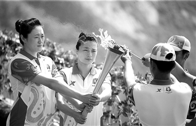 图为辽宁籍奥运冠军刘亚男(左)、王娇在仪式现场采集圣火。