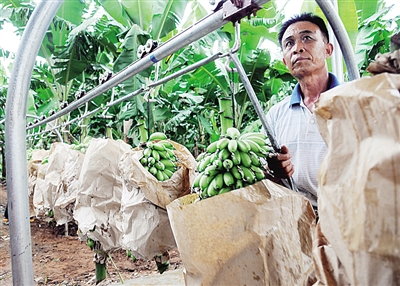 近期,在位于海南省白沙黎族自治县的龙江国营农场香蕉种植国家示范基地,由农场自行选材设计安装的采蕉索道投入使用。图为一名蕉农利用采蕉索道将刚砍下的香蕉由蕉田运到蕉棚打包区。彭 桐摄(新华社发)