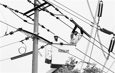 7月28日,国网山东高密市供电公司检修(建设)工区检修人员头顶烈日对10千伏众和线实施带电作业。带电作业是该公司实施减少停电的一项技术措施,可以提高电网运行水平,实现增供扩销。 孙 佳摄
