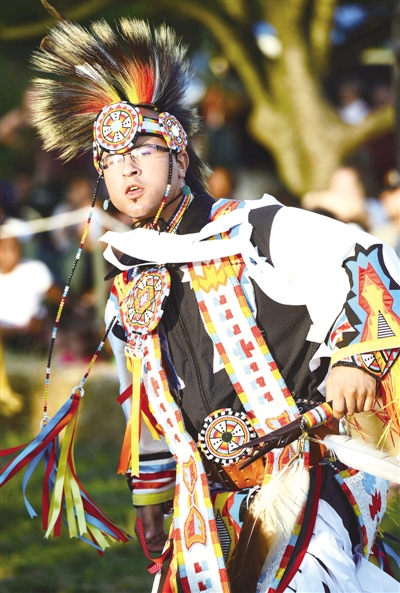 7月27日,一名身着传统装束的印第安人在美国纽约举行的“帕瓦仪式”上表演舞蹈。当天,纽约市举行了规模最大的印第安人“帕瓦仪式”。 (新华社发)