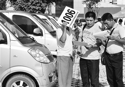 7月28日,广西柳州市柳南区公务用车拍卖会,市民在挑选车辆参与竞拍。据测算,实施公务用车制度改革后,柳南区每年节约财政资金570万元。