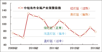 二季度,中经有色金属产业预警指数为76.7,较一季度下降13个点,由 “绿灯”区回落至“浅蓝灯”区。库存高企,需求不振,以及美元走强的预期导致有色金属产业低位运行。