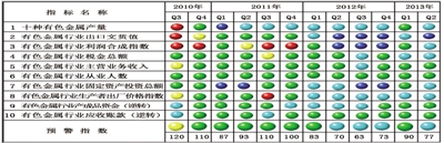 在构成中经有色金属产业预警指数的10个指标(仅剔除季节因素,保留随机因素)中,位于“绿灯”区间的有4个指标,位于“浅蓝灯”区间的有5个指标,位于“蓝灯”区间的有1个指标。