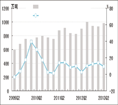 经初步季节调整,二季度我国十种有色金属产量为981.4万吨,同比增长9.3%,增速较一季度放缓4.2个百分点。二季度宏观经济增速放缓导致基本金属的需求低迷,短期内企业的预期难以改善。此外,上半年有色金属价格整体波动走低,也使得二季度企业生产积极性减弱。