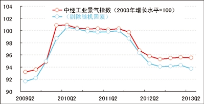 进一步剔除随机因素后,中经工业景气指数呈现回落走势(见景气指数走势图中的蓝色曲线),比未剔除随机因素的指数(见景气指数走势图中的红色曲线)值低1.8个点,两者之差较上季度扩大0.5个点,这表明工业经济增长的内生动力仍然不足。