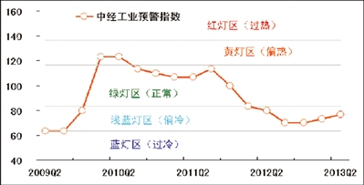 二季度,中经工业预警指数为76.7,比一季度回升3.4点。工业经济继续在略显“偏冷”的浅蓝灯区运行。
