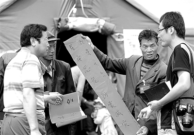 甘肃岷县禾驮乡拉路村临时安置点,当地的党员干部书写了条幅,准备向受灾群众宣传减灾防灾知识。