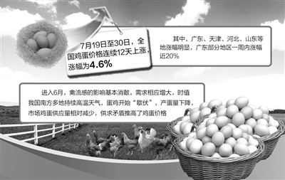 7月中旬以来,受多种因素影响,全国农产品价格呈现出了持续上涨的态势。在经受禽流感疫情严重影响后,鸡蛋价格止跌回暖,步入正常周期性波动。据新华社全国农副产品和农资价格行情系统监测,7月19日至30日,全国鸡蛋价格连续12天上涨,涨幅为4.6%。