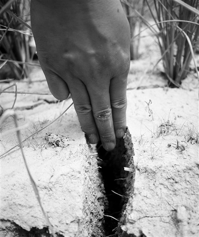 贵州省修文县久长镇上寨村一处缺水开裂的农田,裂缝已可容下成人手掌。该镇已经连续1个月滴雨未降(7月31日摄)。