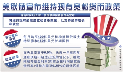 美国联邦储备委员会7月31日结束了为期两天的货币政策会议,会后宣布维持现有的每月购买850亿美元债券资产以及超低利率政策,以刺激经济增长,政策立场未出现重大变化。此间市场分析人士认为,美联储的表态基本上是老调重弹,刻意避免向外界传递有关其债券购买计划的最新信号,虽然市场方面普遍看好下半年经济走势,但无法判定美联储量化宽松政策的退出时间。