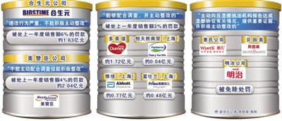 在本次9家被进行价格垄断行为调查的乳粉生产企业中,其中6家企业被处以4000万元到2亿元不等的罚款,有3家企业则被免于处罚。合生元被处上一年度销售额6%的罚款,计1.629亿元;美赞臣被处上一年度销售额4%的罚款,计2.0376亿元;多美滋、雅培、富仕兰、恒天然均被处上一年度销售额3%的罚款,分别被罚1.7199亿元、0.7734亿元、0.4827亿元、0.0447亿元。而惠氏、贝因美、明治则免于处罚。