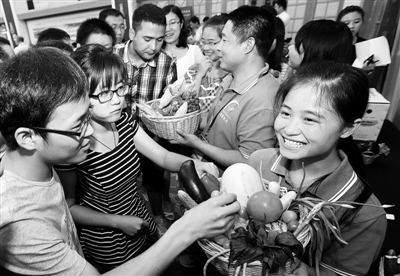 8月9日,来自河北肃宁果蔬种植基地的创业大学生代表介绍他们种植的有机蔬菜瓜果。当日,由中国青年人才培训中心主办的“青年科技人才创业就业服务计划”启动仪式在京举行。该计划包括青年职业生涯规划、有机农庄管理培训、青年创业者参与有机农庄建设等。 本报记者 赵 晶摄