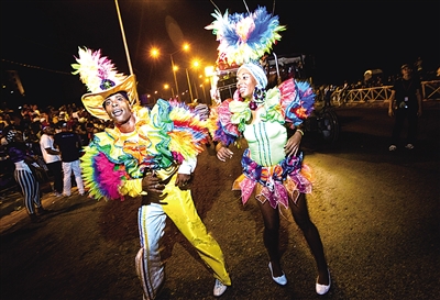 在古巴哈瓦那,演员们在狂欢节上表演。为期10天的哈瓦那狂欢节日前在古巴首都哈瓦那正式开幕。 新华社发