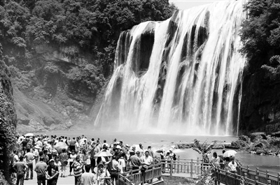 8月17日,游客在游览贵州黄果树大瀑布。7月以来,黄果树景区游客数量持续走高,同比增长32%,日均接待游客1万人次以上,最高时达1.7万人次。 本报记者 吴秉泽摄