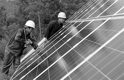8月15日,工人在承德县光伏发电项目工地安装设备。
