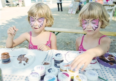 8月19日,在匈牙利中部小城埃尔奇举行的第14届全国双胞胎聚会上,一对双胞胎姐妹在画画。 (新华社发)