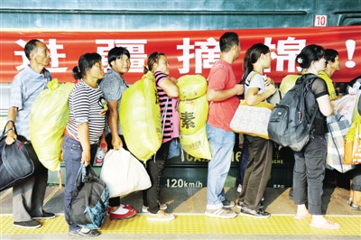 上图 8月25日,进疆摘棉的农民工在郑州火车站准备上车。
