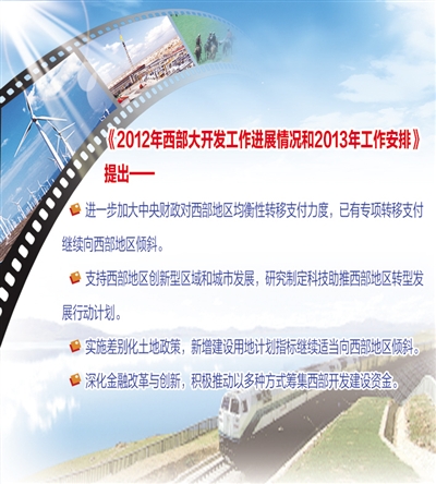 《工作安排》指出,进一步加大中央财政对西部地区均衡性转移支付力度,已有专项转移支付继续向西部地区倾斜。中央预算内资金年度投资计划要加强对西部地区的支持,认真落实中央安排的公益性建设项目取消西部地区县以下(含县)以及集中连片特殊困难地区市地级配套资金的政策。支持西部地区创新型区域和城市发展,研究制定科技助推西部地区转型发展行动计划。