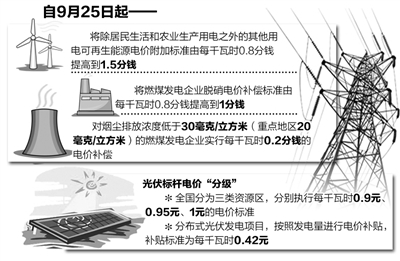 根据方案,自今年9月25日起,将把除居民生活和农业生产以外的其他用电征收的可再生能源电价附加标准由现行的每千瓦时0.8分钱提高至1.5分钱。