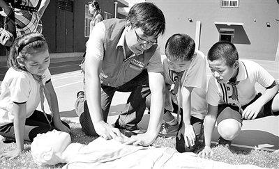 右图:9月1日,国网北京电力公司的志愿者在给北京市官园小学的孩子们示范救生知识。 新华社记者 李 欣摄