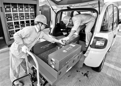 图为浙江金华东关电动汽车充电站两名工作人员在给市民的纯电动汽车更换标准电池。