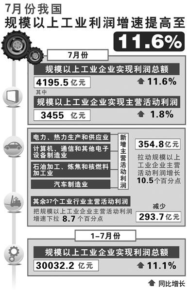 今年前7个月,全国规模以上工业企业实现利润总额30032.2亿元,比去年同期增长11.1%。其中,7月份当月实现利润总额4195.5亿元,比去年同期增长11.6%,增速较6月份提高5.3个百分点。