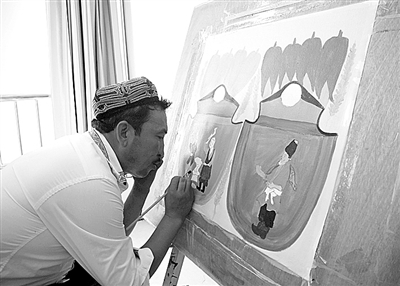 《葡萄架下》、《赶巴扎》、《捡棉花》……盛夏时节,走进新疆麦盖提县,一幅幅反映农村生产生活的画作映入眼帘,浓郁的南疆风情扑面而来。