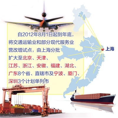根据国务院有关部署,自2012年8月1日起到年底,将交通运输业和部分现代服务业营改增试点,由上海分批扩大至北京、天津、江苏、浙江、安徽、福建、湖北、广东8个省、直辖市及宁波、厦门、深圳3个计划单列市。截至2012年10月,上海市共减轻试点企业和下游企业税负170多亿元